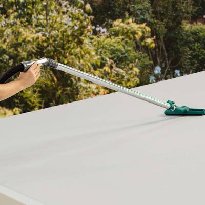 Nach dem trockenen Abfegen beginnt die gründliche Feuchtreinigung der Markise. Diese erledigen Sie mit einem weichen Schrubber oder Schwamm. Mit Leiter und Teleskopstiel kommen Sie gut an alle Elemente heran. Gegen festen Schmutz hilft ein Wasserstrahl aus dem Gartenschlauch. Vorsicht: Um Beschädigungen zu vermeiden, sollten Sie für die Reinigung Ihrer Markisenstoffe auf keinen Fall einen Hochdruckreiniger einsetzen.